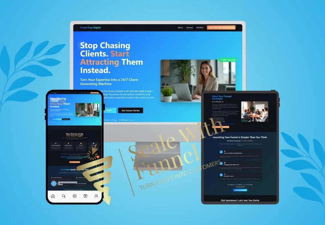 A funnel is a strategic sequence of web pages and automated systems designed to guide potential customers through your sales process. It captures leads, nurtures them with valuable content, and converts them into paying clients automatically.